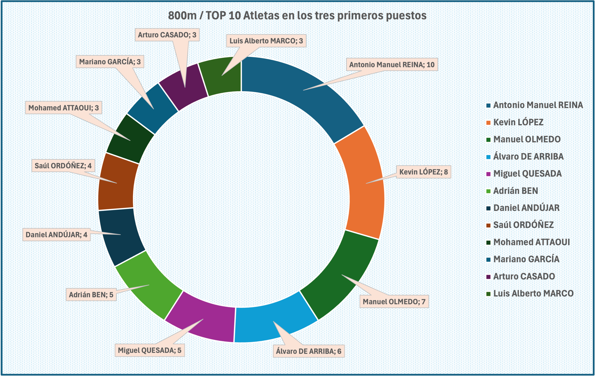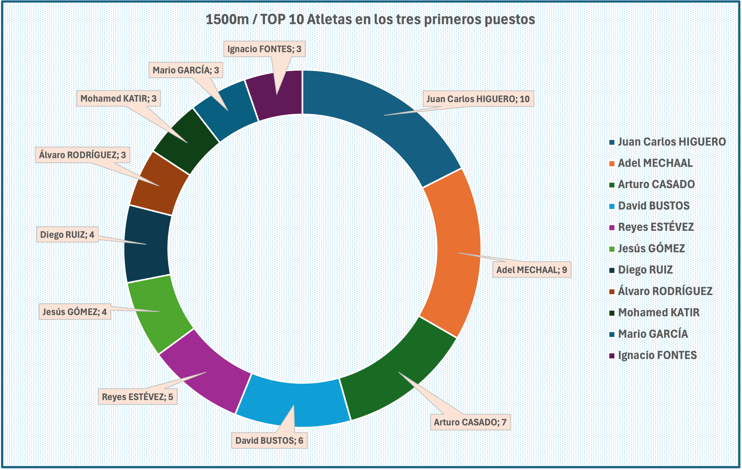 Podemos ver a continuación el TOP 10 atletas que más veces han estado en las primeras posiciones, con Juan Carlos Higuero con 10 apariciones en primera posición.