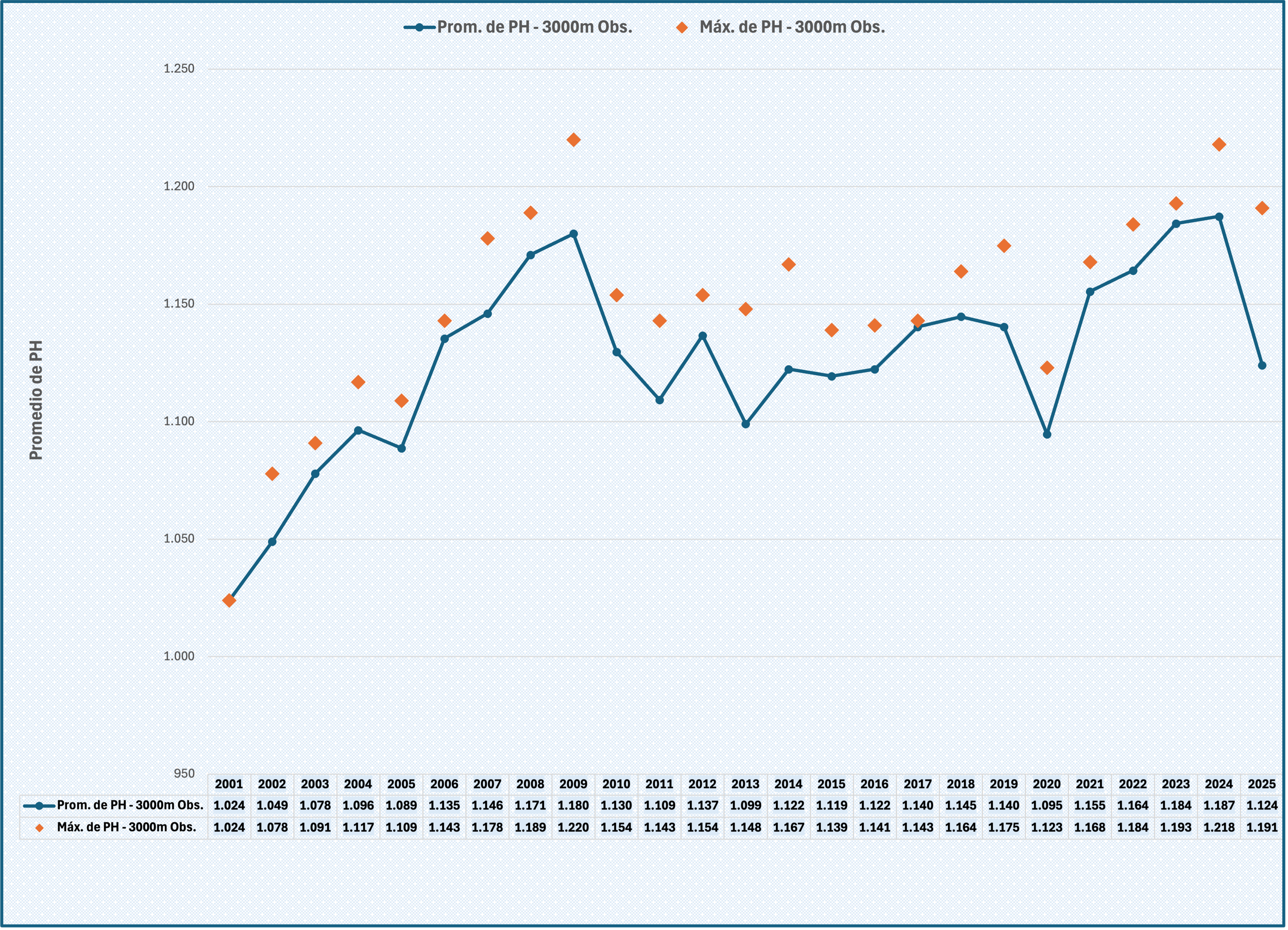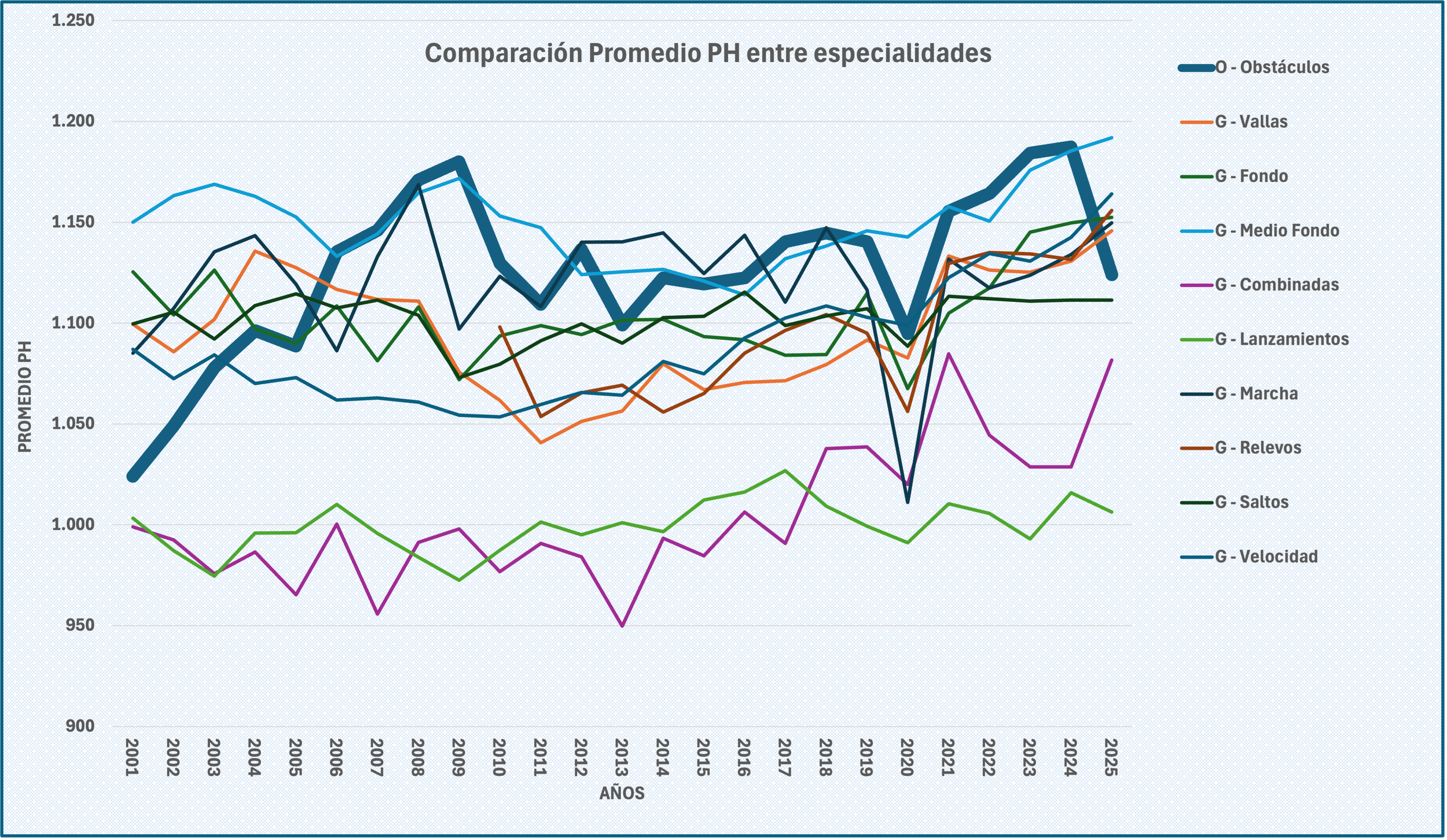En este caso, exclusivo del 3.000 Obstáculos. Mostramos la evolución de los últimos 25 años con el promedio (líneas) y máximos (marcadores).