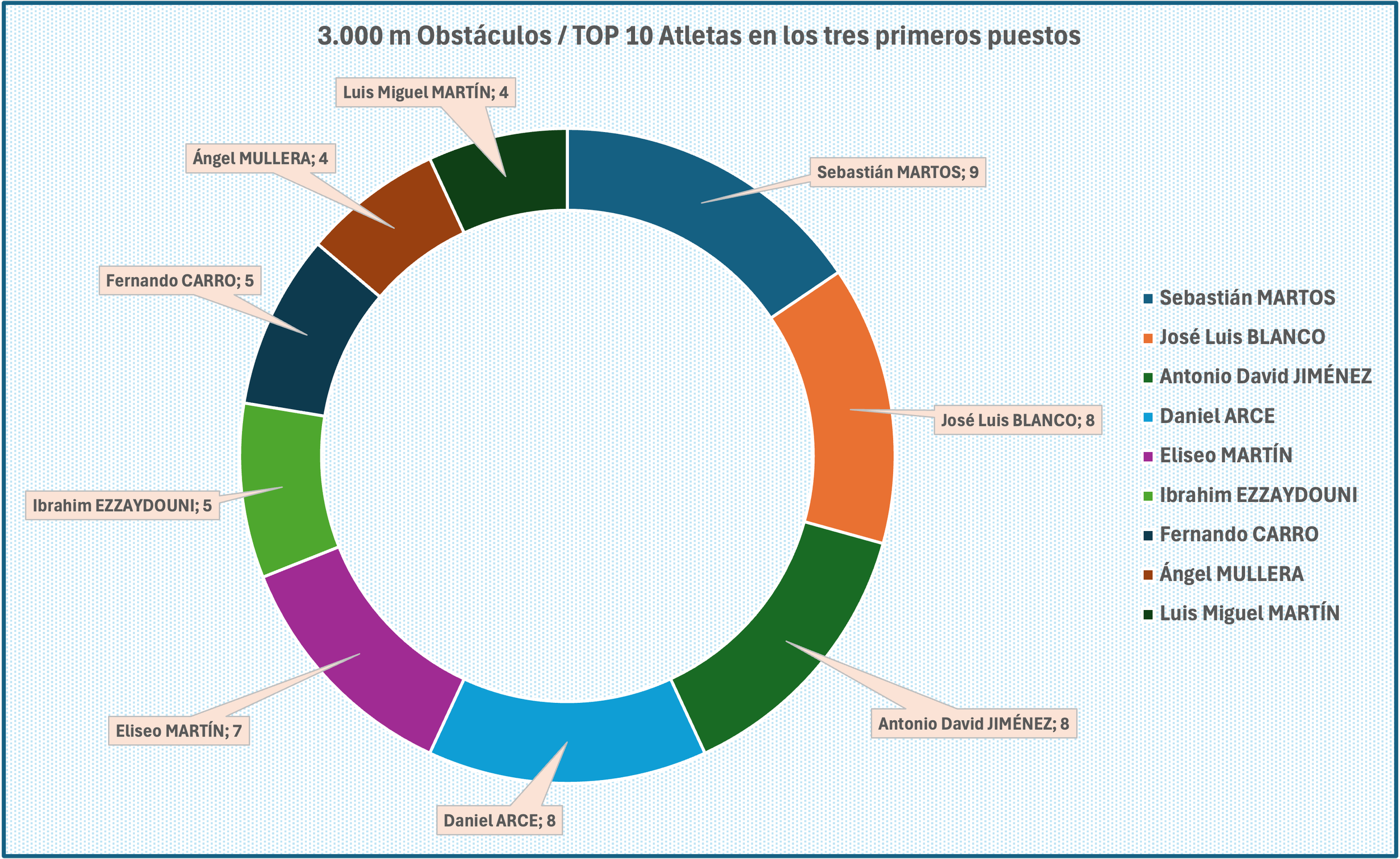 Podemos ver a continuación el TOP 10 atletas que más veces han estado en las primeras posiciones. Ahí tenemos a Sebastián MARTOS con 9 veces, desde el 2013 al 2022, seguido de José Luis BLANCO , Antonio David JIMÉNEZ y Daniel ARCE con 8 (6º, 5º y 3ºdel ranking españolrespectivamente.