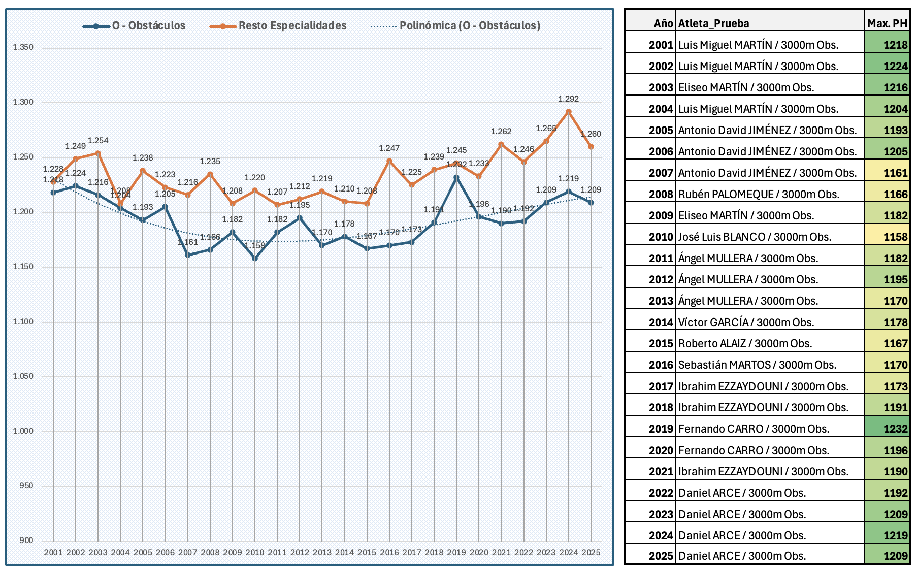 En este caso, exclusivo del 3.000 Obstáculos. Mostramos la evolución de los últimos 25 años con el promedio (líneas) y máximos (marcadores).