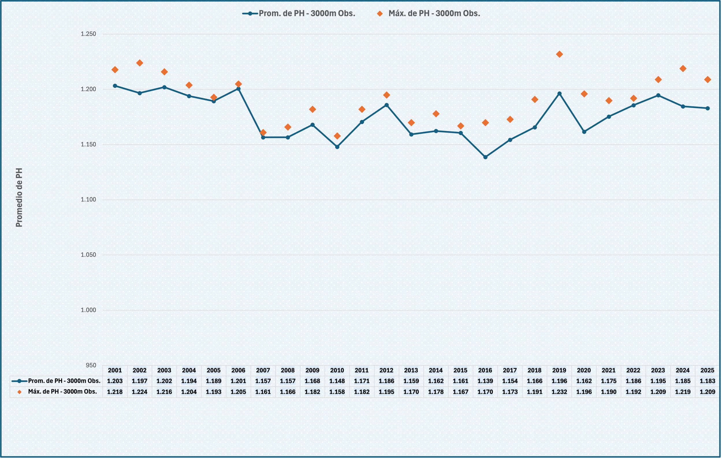 En el gráfico se muestra en barras el promedio anual de PH y en puntos el máximo PH alcanzado. La leyenda del eje horizontal muestra el año y la atleta que mejor marca obtuvo. En rojo se indican las mejores marcas, el récord de España de Fernando CARRO en 2019 y las mejores marcas de Luis Miguel MARTÍN y Daniel ARCE.
