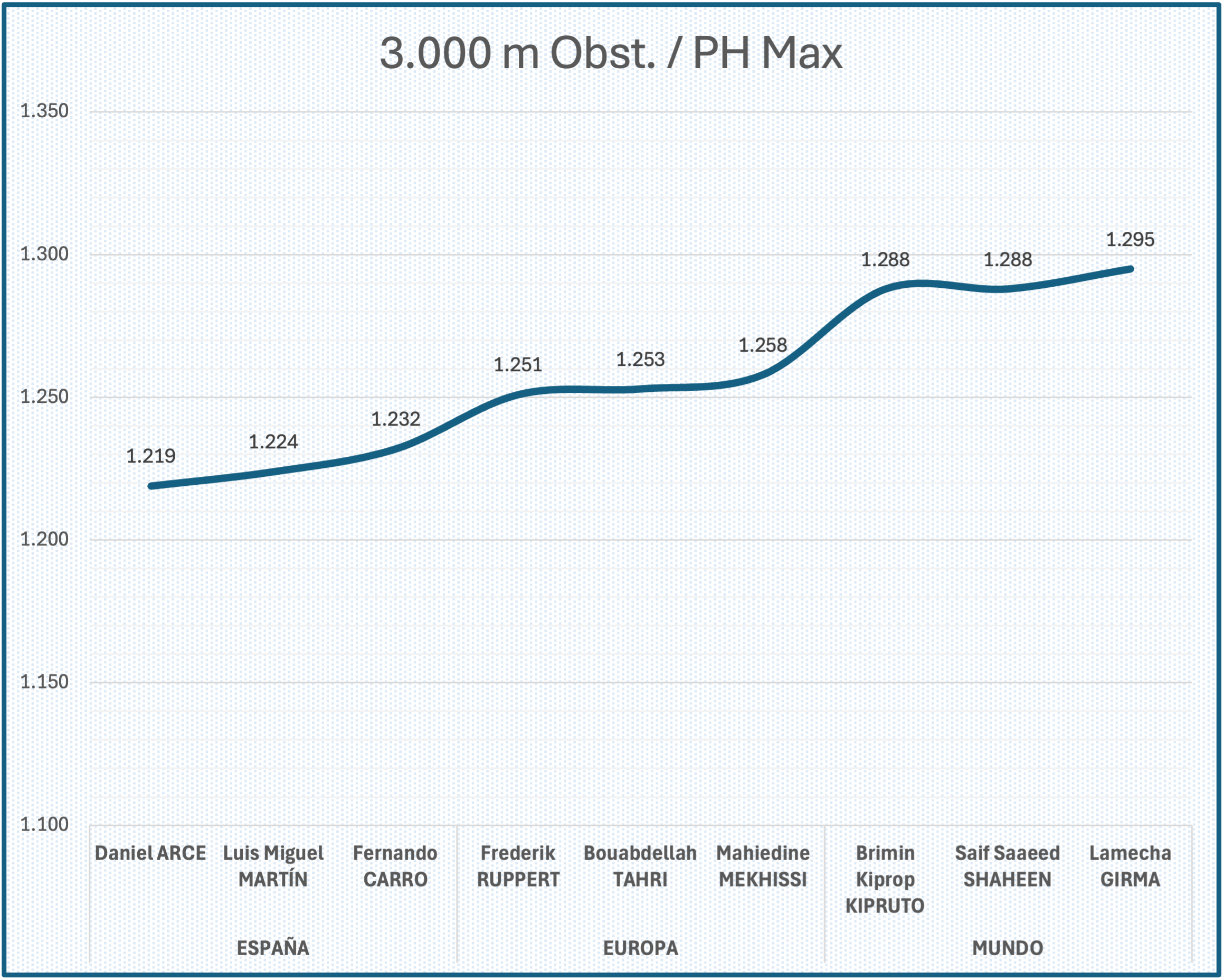 Como conclusión, el 3.000 metros Obstáculos masculino es una de nuestras mejores especialidades, dentro del Atletismo español, con valores de puntos húngaros en el borde de los 1200 puntos sostenidos a lo largo de los últimos 25 años.