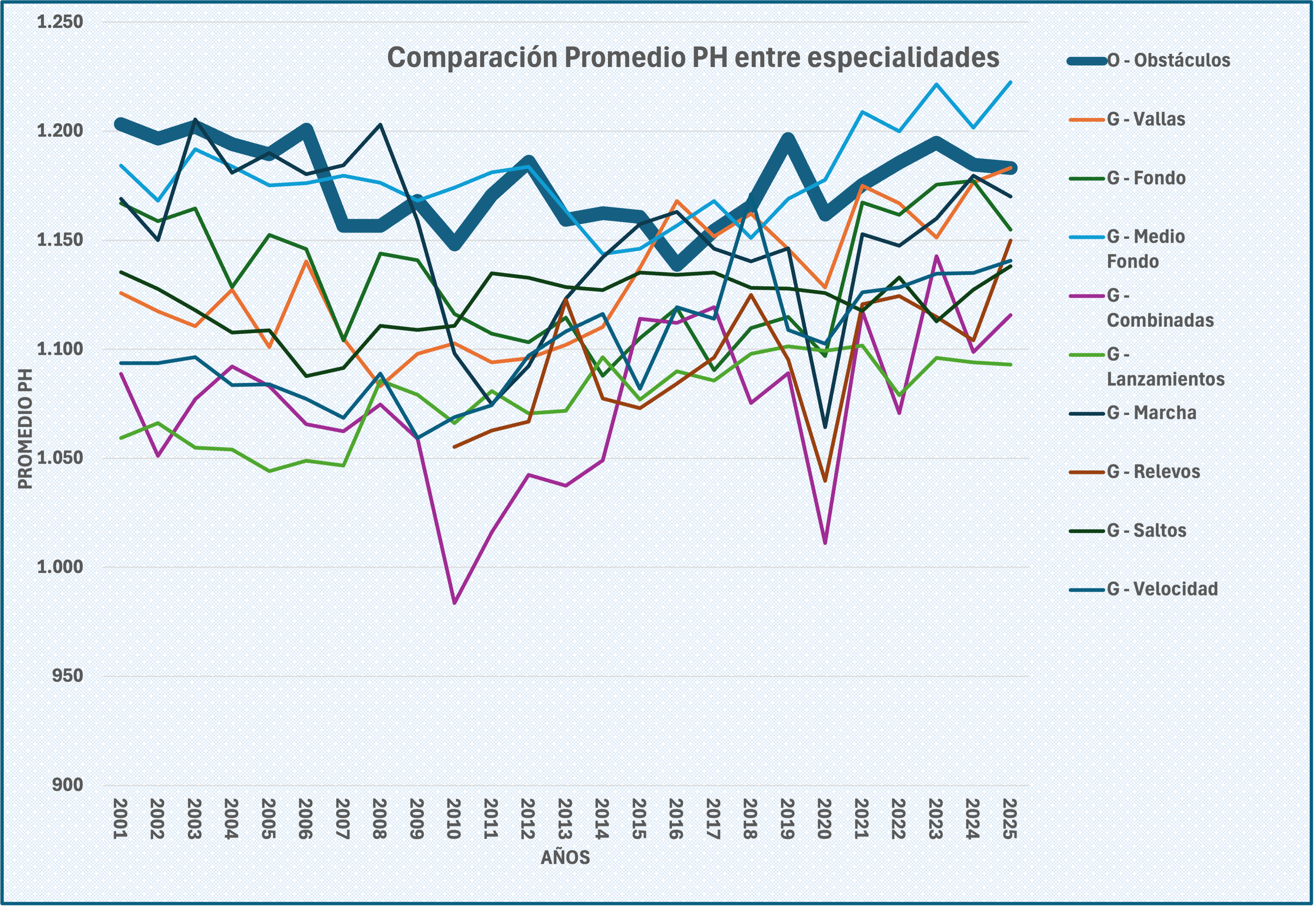 Se muestra resaltada la serie de Obstáculos. Como podemos apreciar, es una de nuestras especialidades “estrella”, a la altura del medio fondo. En los primeros 2000 estuvimos incluso por encima de los 1.200 puntos, bache posterior, aunque ligero, desde 2006 a 2018 (como muchas otras de nuestras especialidades) y remontada posterior hasta la actualidad..