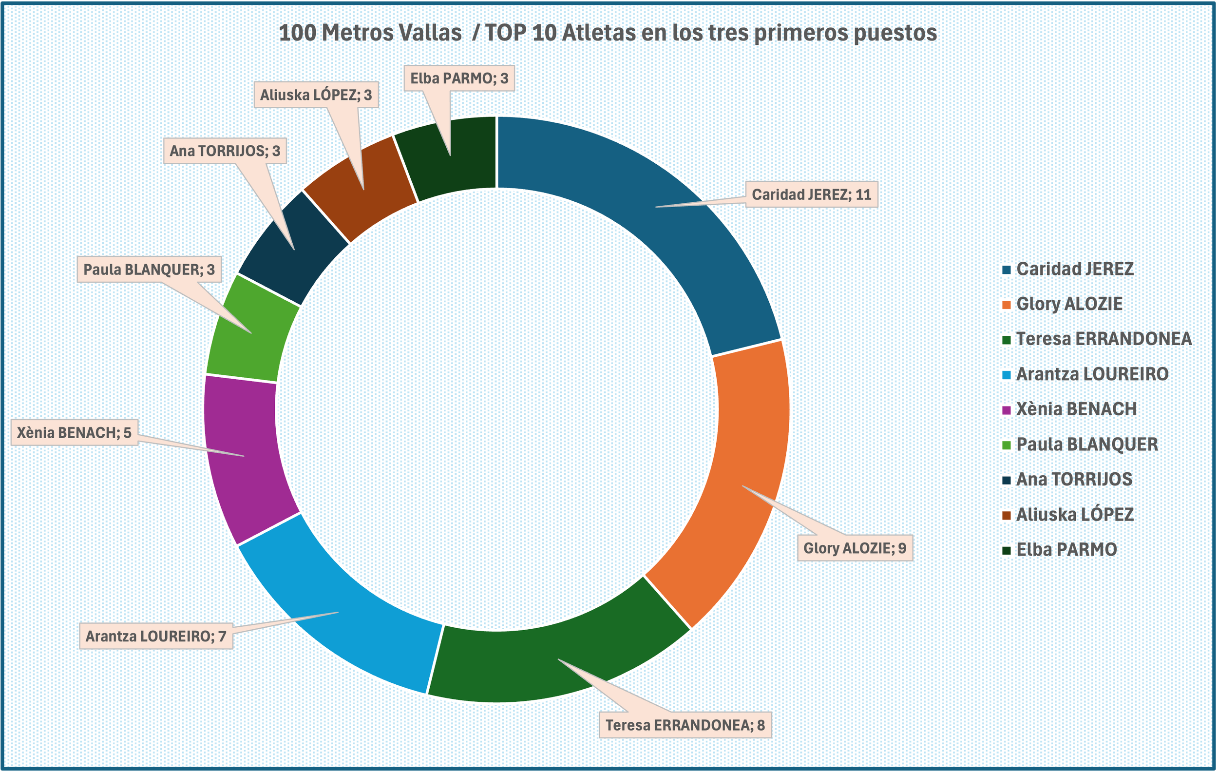 Podemos ver a continuación el TOP 10 atletas que más veces han estado en las primeras posiciones. Ahí tenemos a Caridad Jerez con 11 veces, seguida de Glory ALOZIE con 9 y Teresa ERRANDONEA con 8. Resaltar que NO aparece Josephine ONYIA, sólo estuvo dos veces entre las tres primeras. El 28 de enero de 2016 fue suspendida de por vida por dopaje por la IIAF tras su cuarto positivo detectado en un control realizado el 1 de agosto de 2015 en el Campeonato de España (Wikipedia)