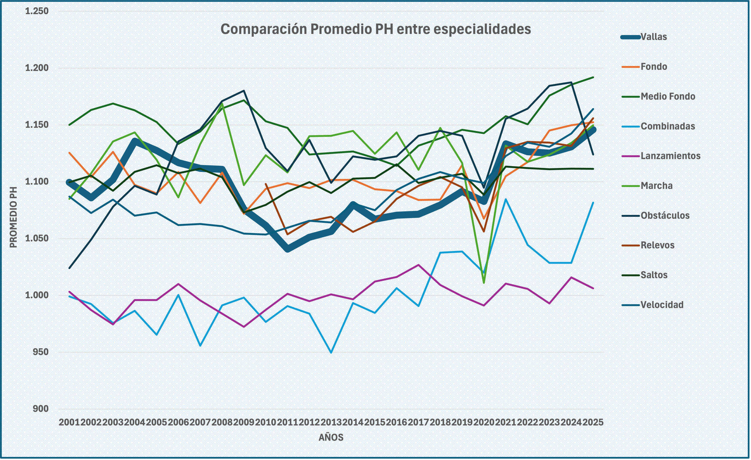 Se muestra resaltada la serie de Vallas. Se aprecia una posición media-alta en los primeros años 2000, seguido del acusado bache en los años alrededor del 2010 (esto lo estamos viendo en casi todas las especialidades), para progresar junto con casi todo el resto en la década de 2020, tras el COVID, para quedarse en el grupo cabecero a partir de entonces.
