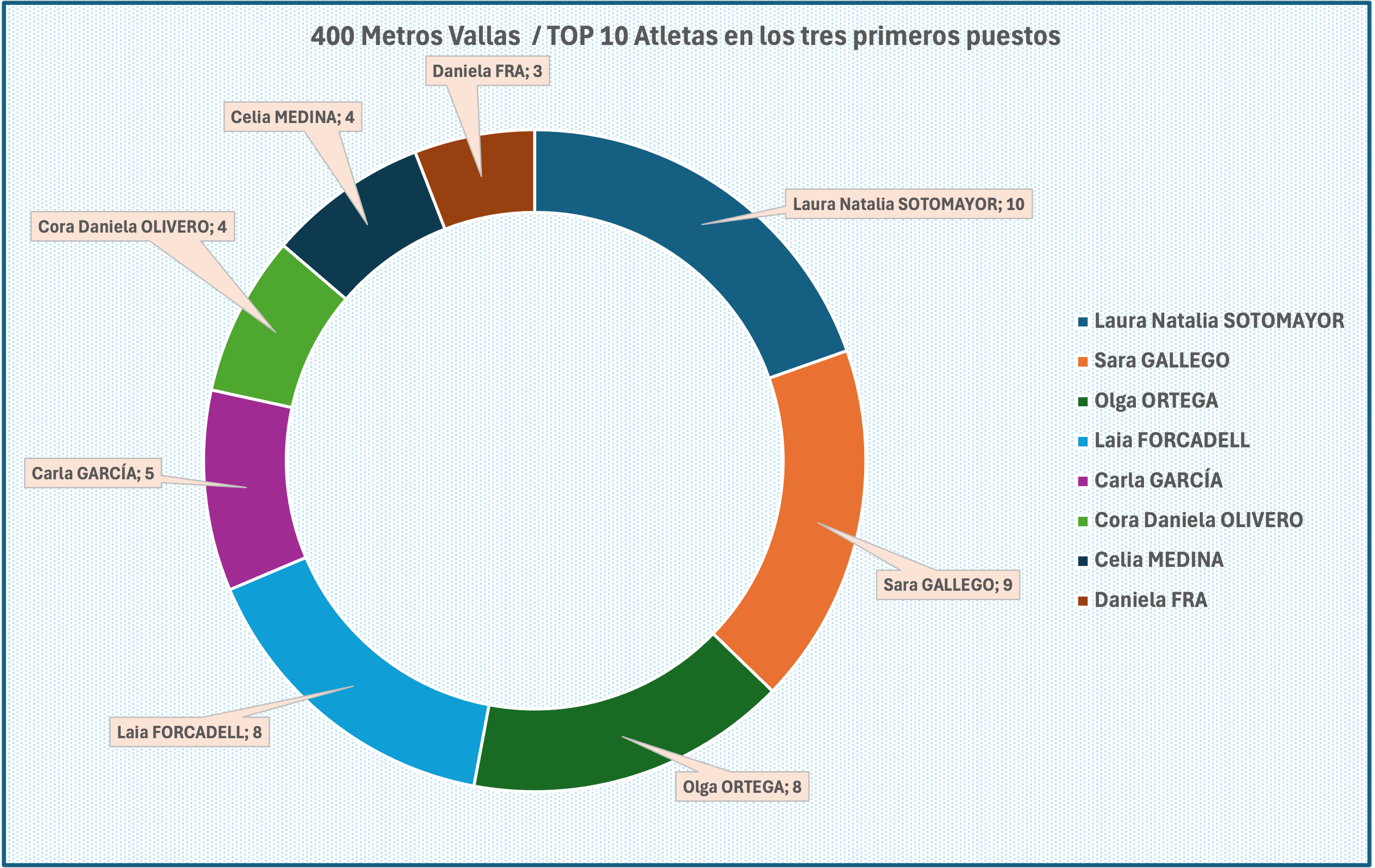 Podemos ver a continuación el TOP 10 atletas que más veces han estado en las primeras posiciones (8 en este caso, el resto tiene 2 o menos apariciones en el top 3), con Laura Natalia SOTOMAYOR con 10 apariciones en primera posición, seguida de Sara GALLEGO con 8.