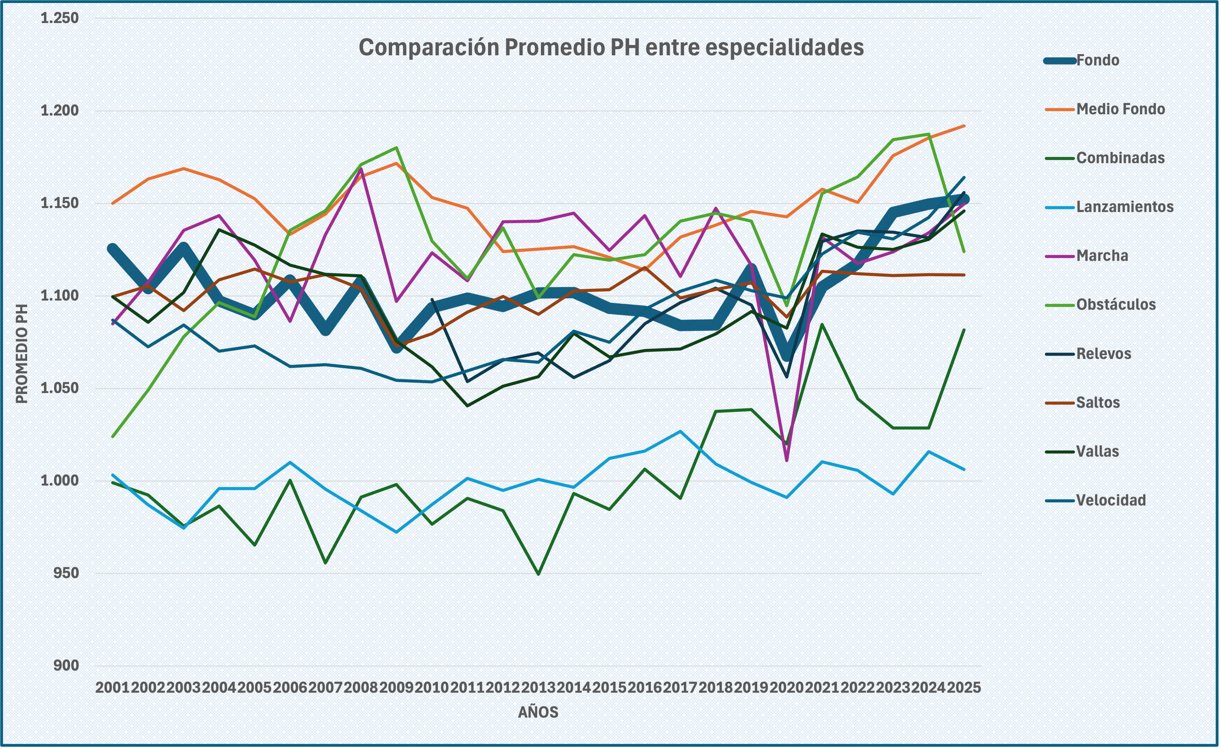Podríamos considerar que las pruebas en promedio van bastante parejas en la serie histórica, con los repuntes finales del Maratón y el 5.000.