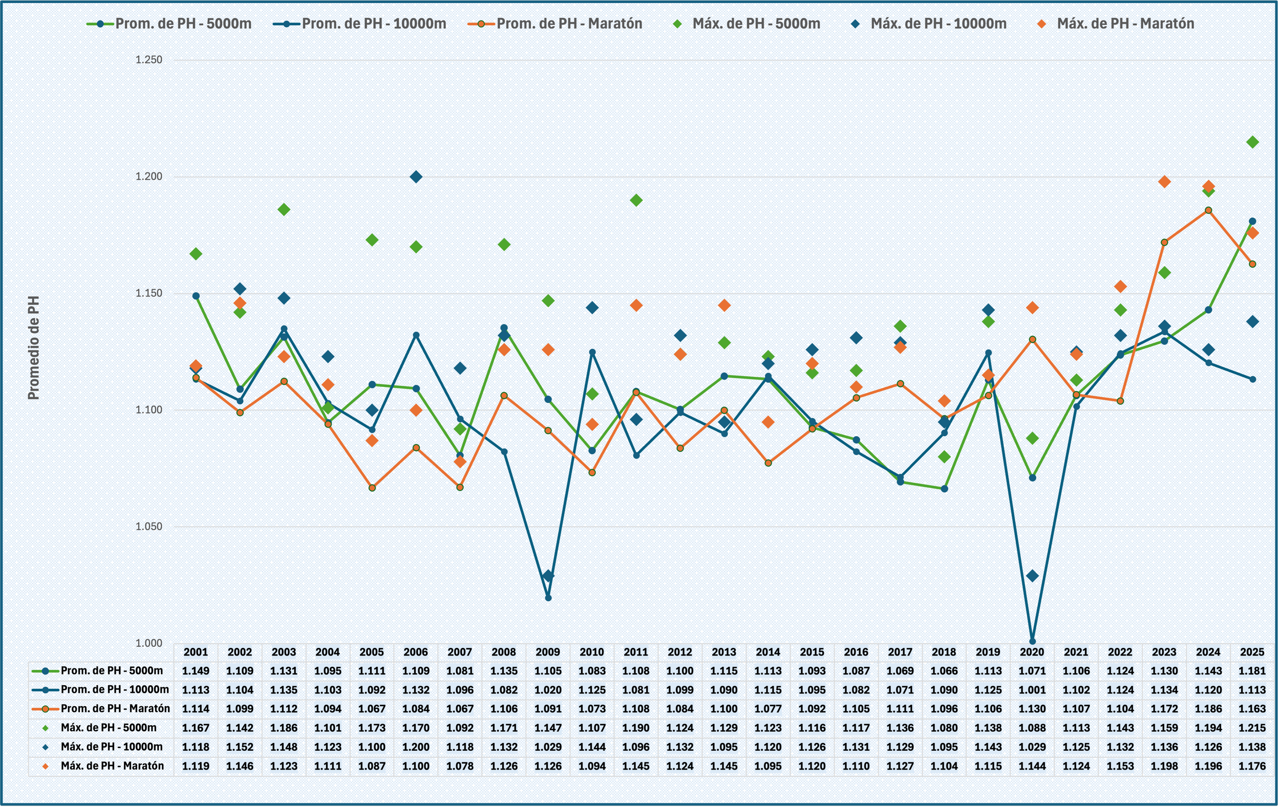 En el gráfico se muestra en barras el promedio anual de PH y en puntos el máximo PH alcanzado. La leyenda del eje horizontal muestra el año y la atleta que mejor marca obtuvo. En rojo se indican las tres mejores marcas del periodo.