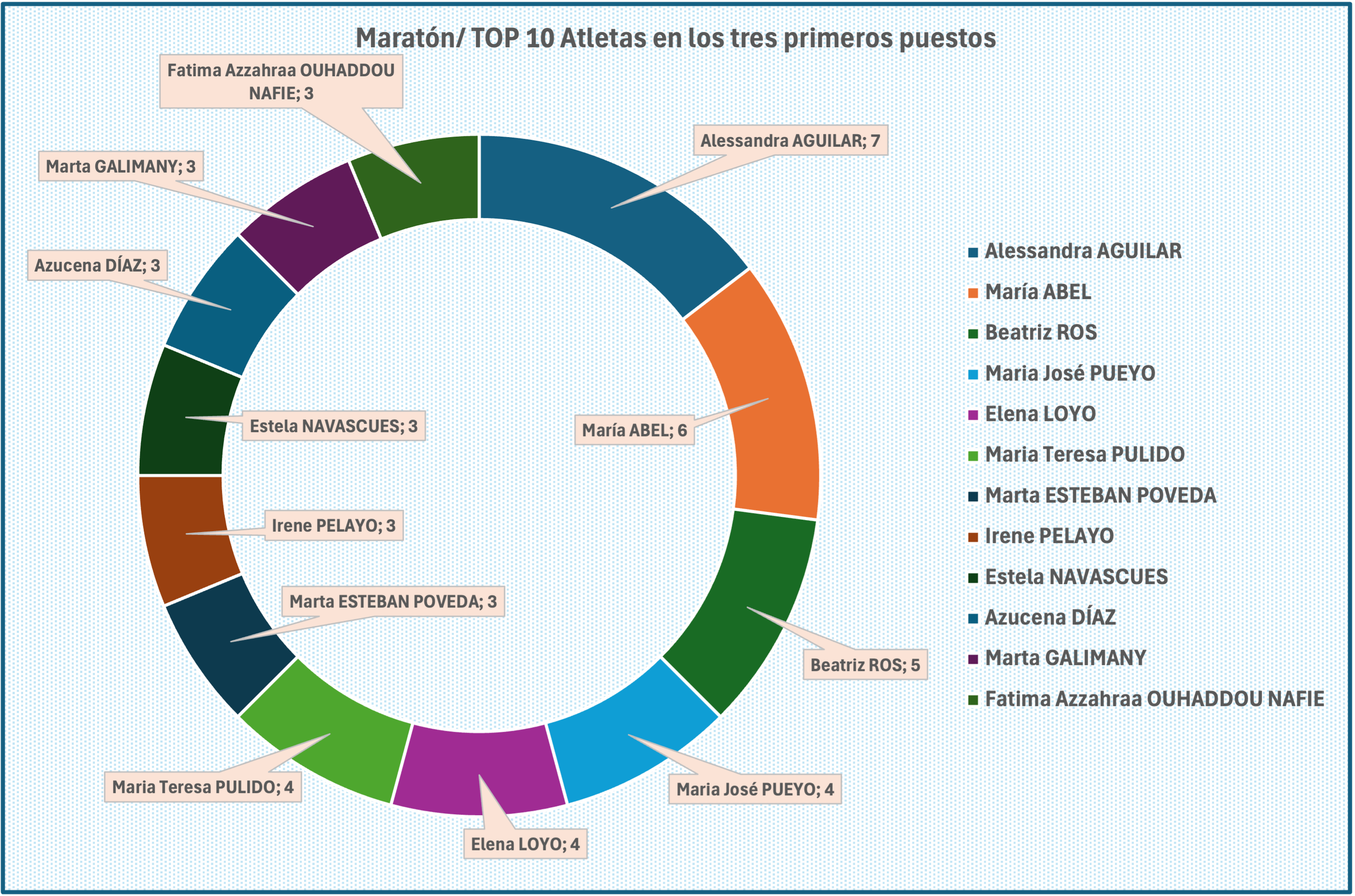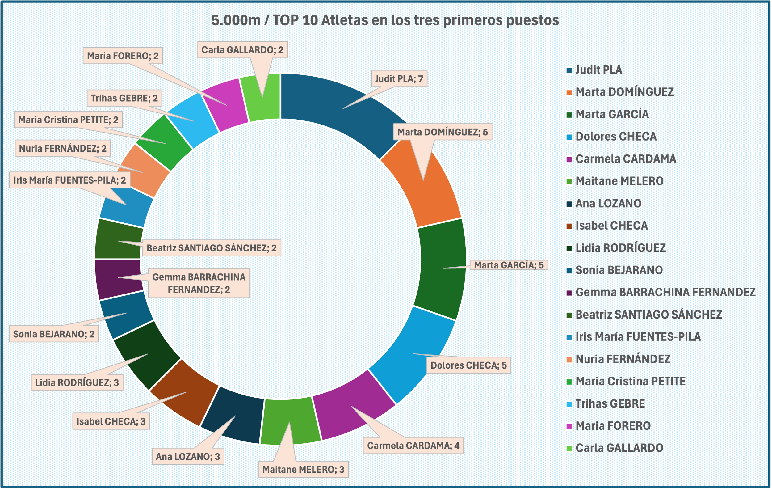 Podemos ver a continuación el TOP 10 atletas (más en este caso, por repetirse varias con 2 apariciones). Judit Plá (7), desde el 2006 al 2013 es la atleta que más veces aparece, seguida de Marta Domínguez (5) del principio de la serie histórica y Marta Garcia / Dolores Checa con 5 apariciones.
