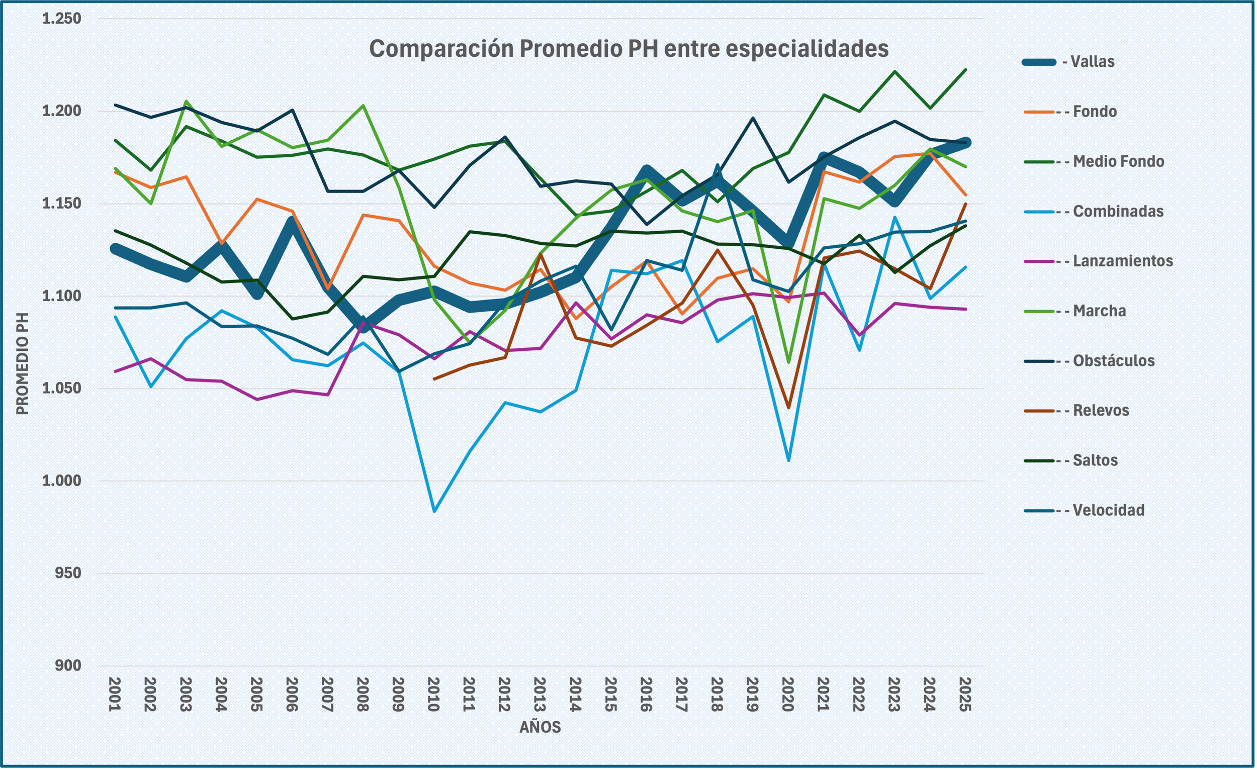 Se muestra resaltada la serie de Vallas. Se aprecia una posición media en los primeros años 2000, para comenzar un periodo más bajo alrededor de 2008 hasta el 2016. A partir de aquí se produce una mejora que se sostiene hasta 2025, sólo superada por los obstáculos y por el medio fondo.