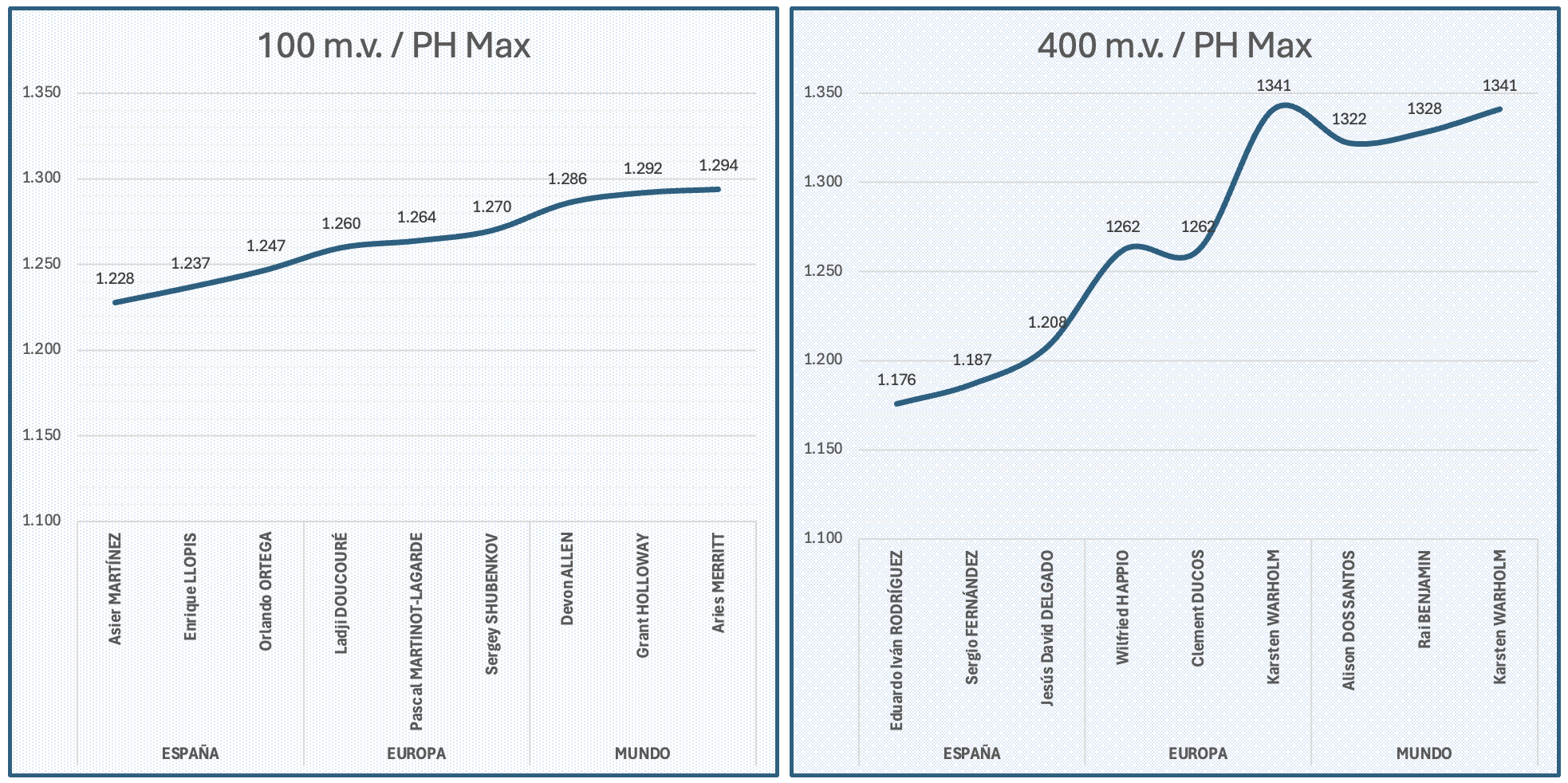Como conclusión, el 110 m.v. goza de buena salud, con valores por encima de los 1200 puntos desde Orlando ORTEGA y está muy por encima del 400 mv, incluso con el reciente récord de Jesús David DELGADO