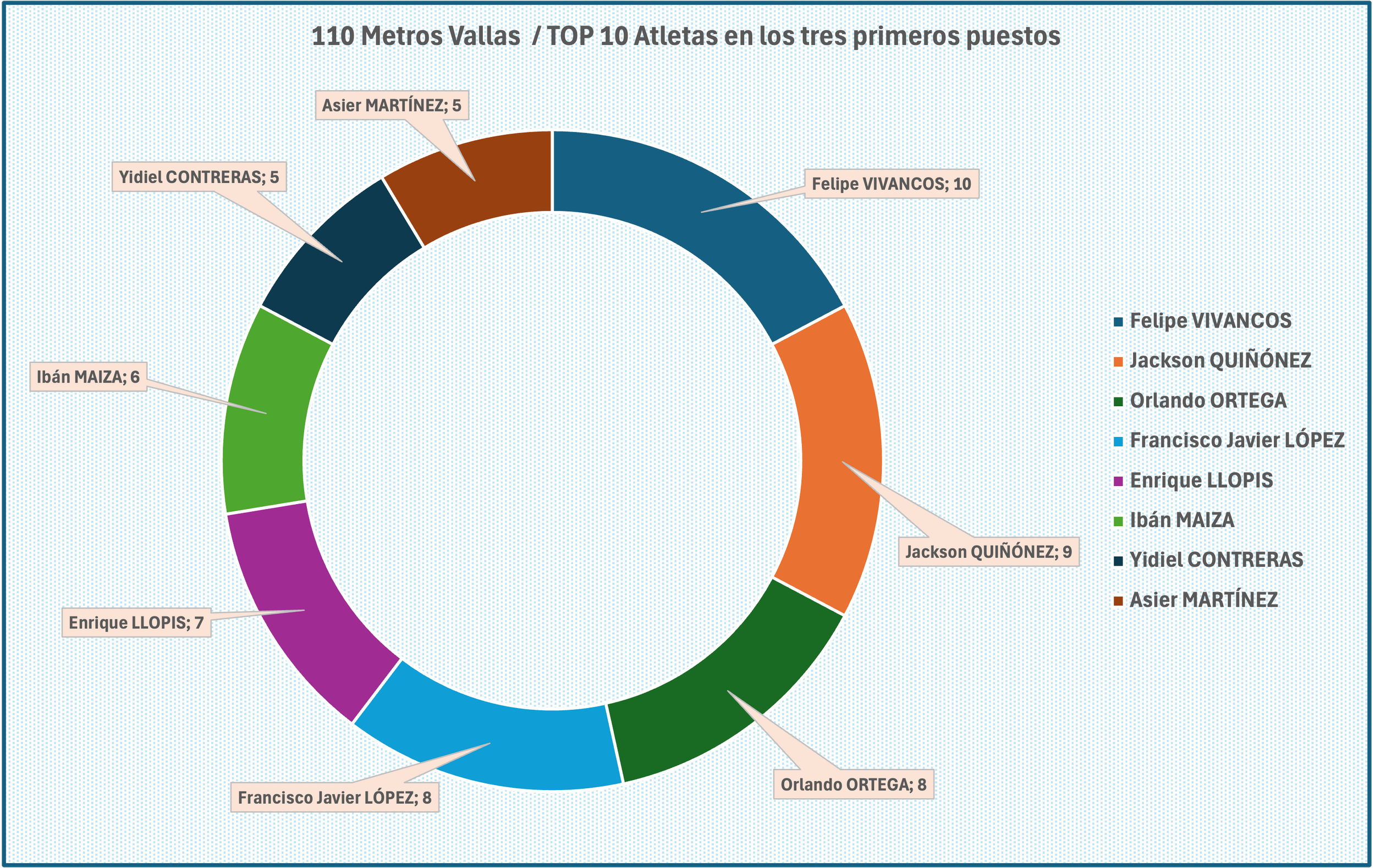 Podemos ver a continuación el TOP 10 atletas que más veces han estado en las primeras posiciones. Ahí tenemos a Felipe VIVANCOS con 10, seguida de Jackson QUIÑÓNEZ con 9 y Orlando ORTEGA con 8.